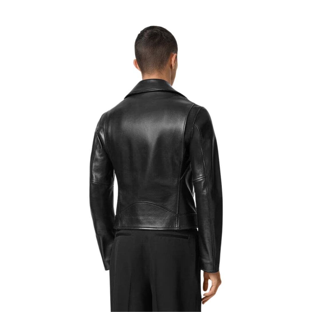 At first glance, the jacket commands attention with its sleek silhouette and unmistakable Versace flair. Made from supple, buttery-soft leather, it molds effortlessly to the body, offering both comfort and style. The rich, deep black hue exudes timeless elegance, while subtle embossed Medusa head accents on the hardware add a touch of opulence.