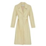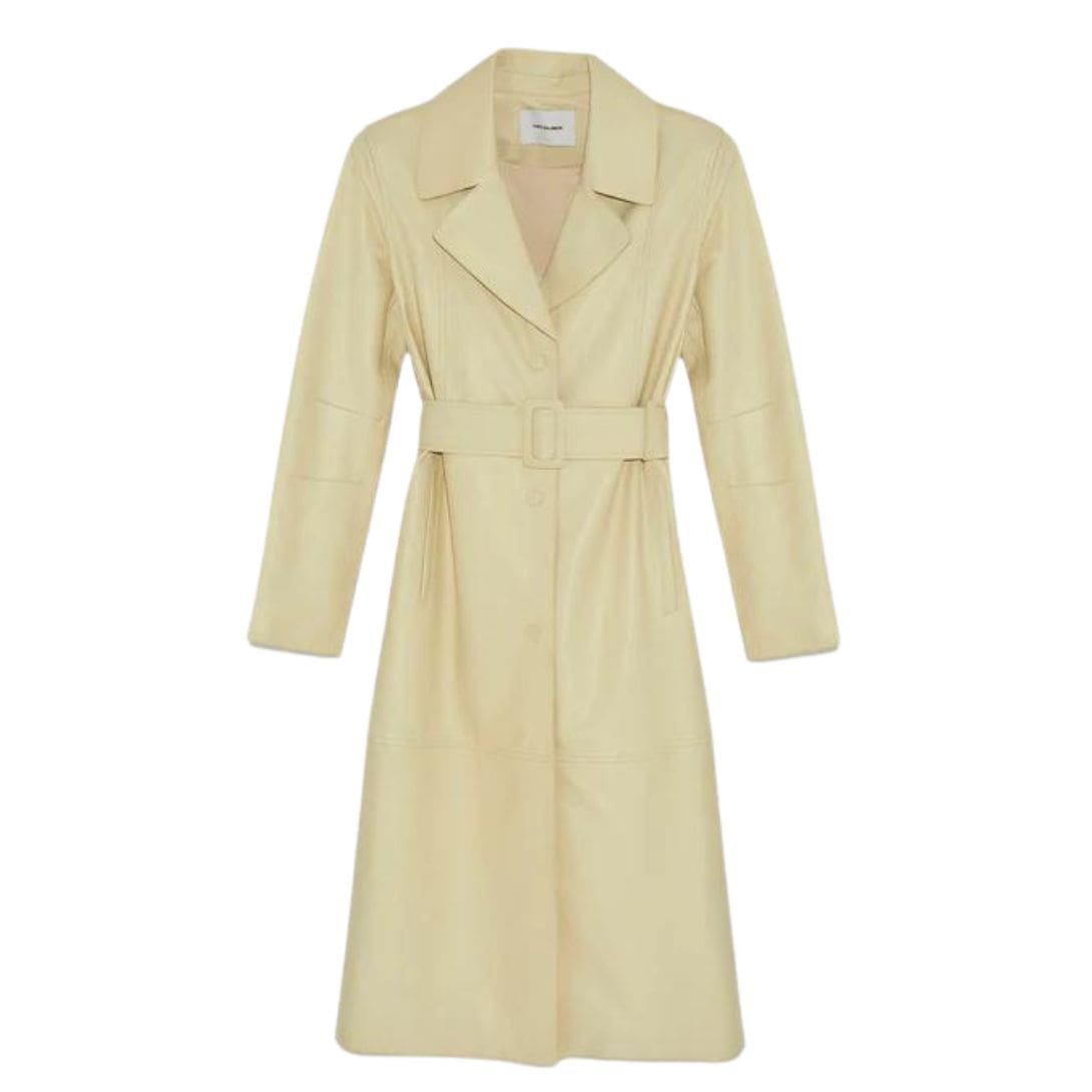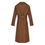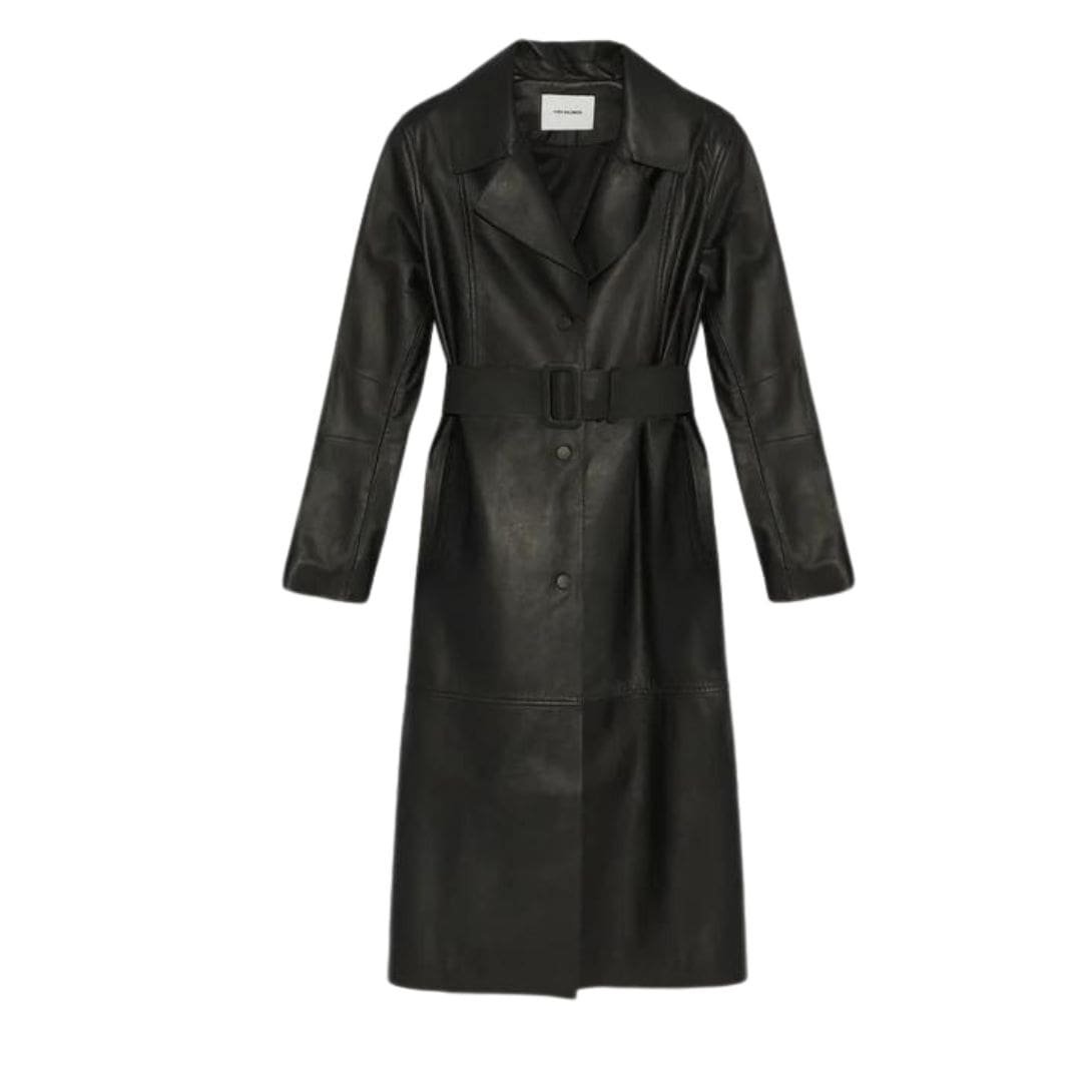 - Long belted trench coat with a fitted silhouette