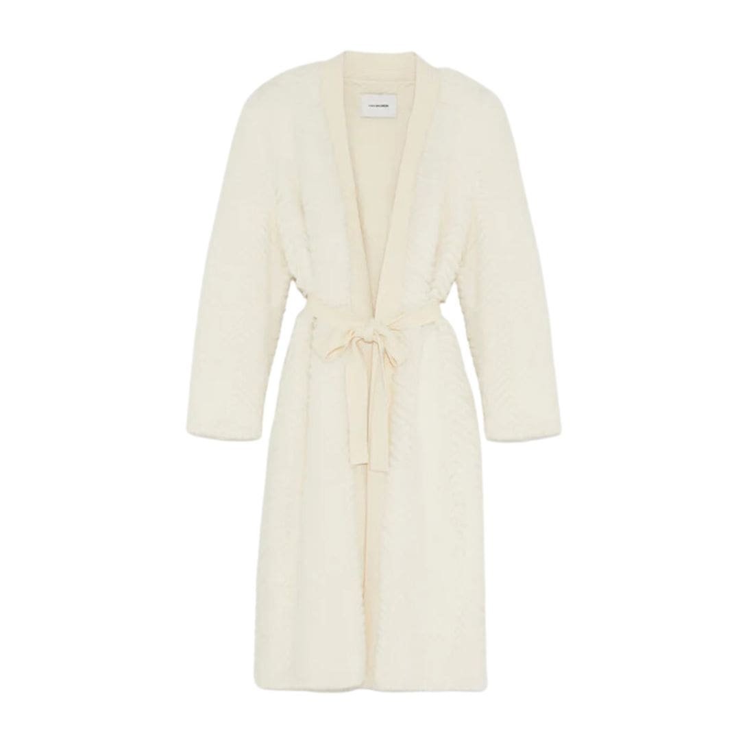 Experience Yves Salomon Merino Knit And Mink Long Cardigan that combines the softness of merino wool with the sophistication of mink, featuring a graphic finish. With long sleeves, a knee-length fit, and side pockets, it can be worn belted or loose, offering versatile styling options.